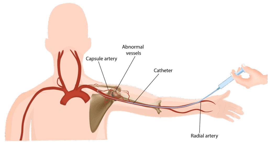MSK embolization is performed through a small puncture in the wrist or groin, without any surgical incision. Using real-time imaging guidance, a thin catheter is navigated to the abnormal blood vessels supplying the inflamed area. Tiny embolic particles are then delivered to reduce abnormal blood flow and inflammation.